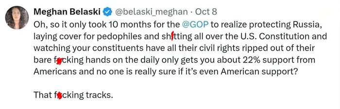 “It’s coming to an end guys. I’ve spoken to a lot of House Republicans this week and they’ve confided that Trump’s movement/support is fading. As one told me, ‘this Epstein bomb is about to drop and no want wants to defend a pedo-protector. It’s just a matter of time.'”