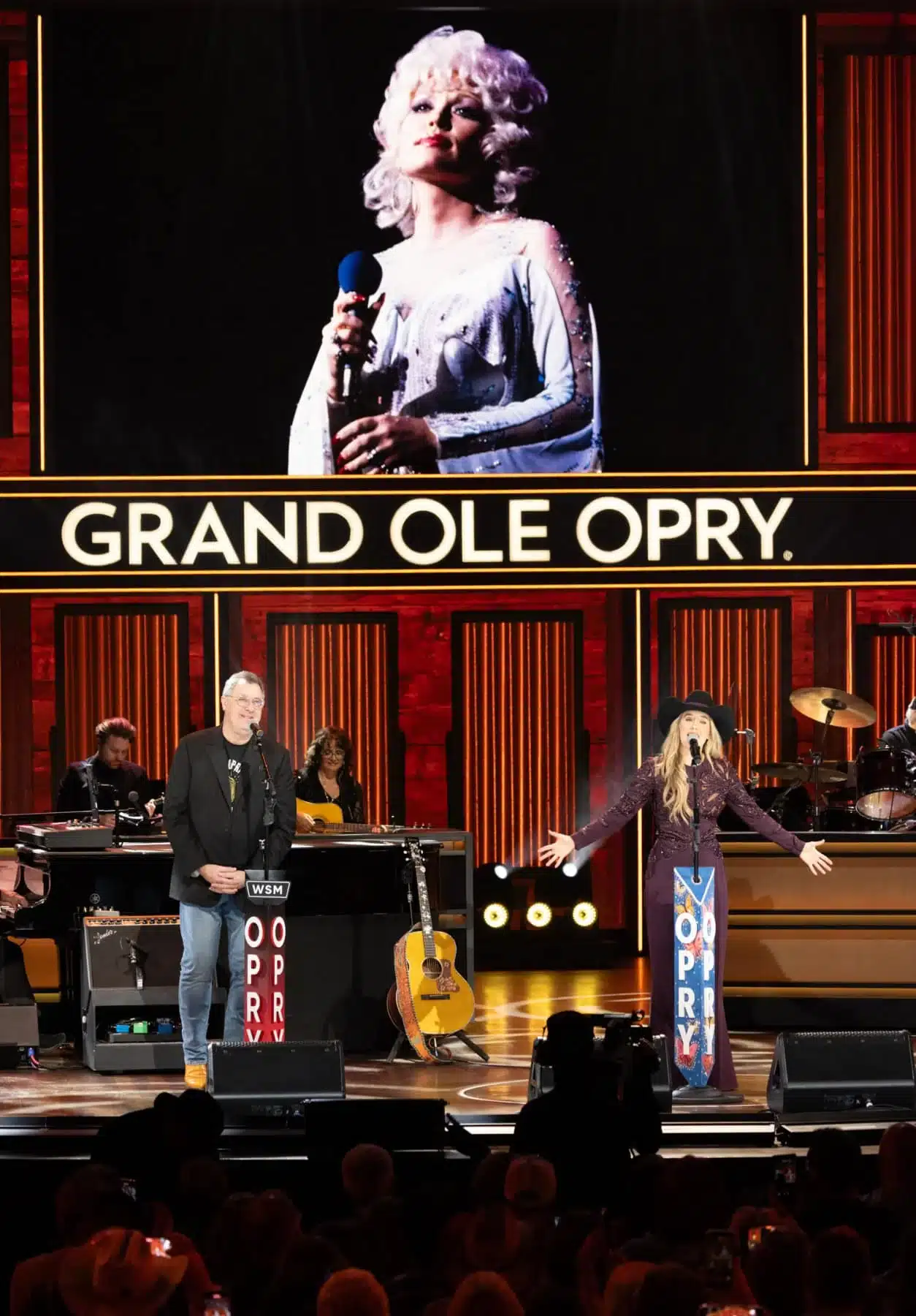 Wilson and Gill then closed their set with a stunning rendition of “I Will Always Love You.” Gill handled the opening verse and chorus before Wilson took over the second verse, with the two joining together in harmony as photos of Parton filled the stage backdrop. The performance brought the Opry crowd to its feet for a prolonged standing ovation.